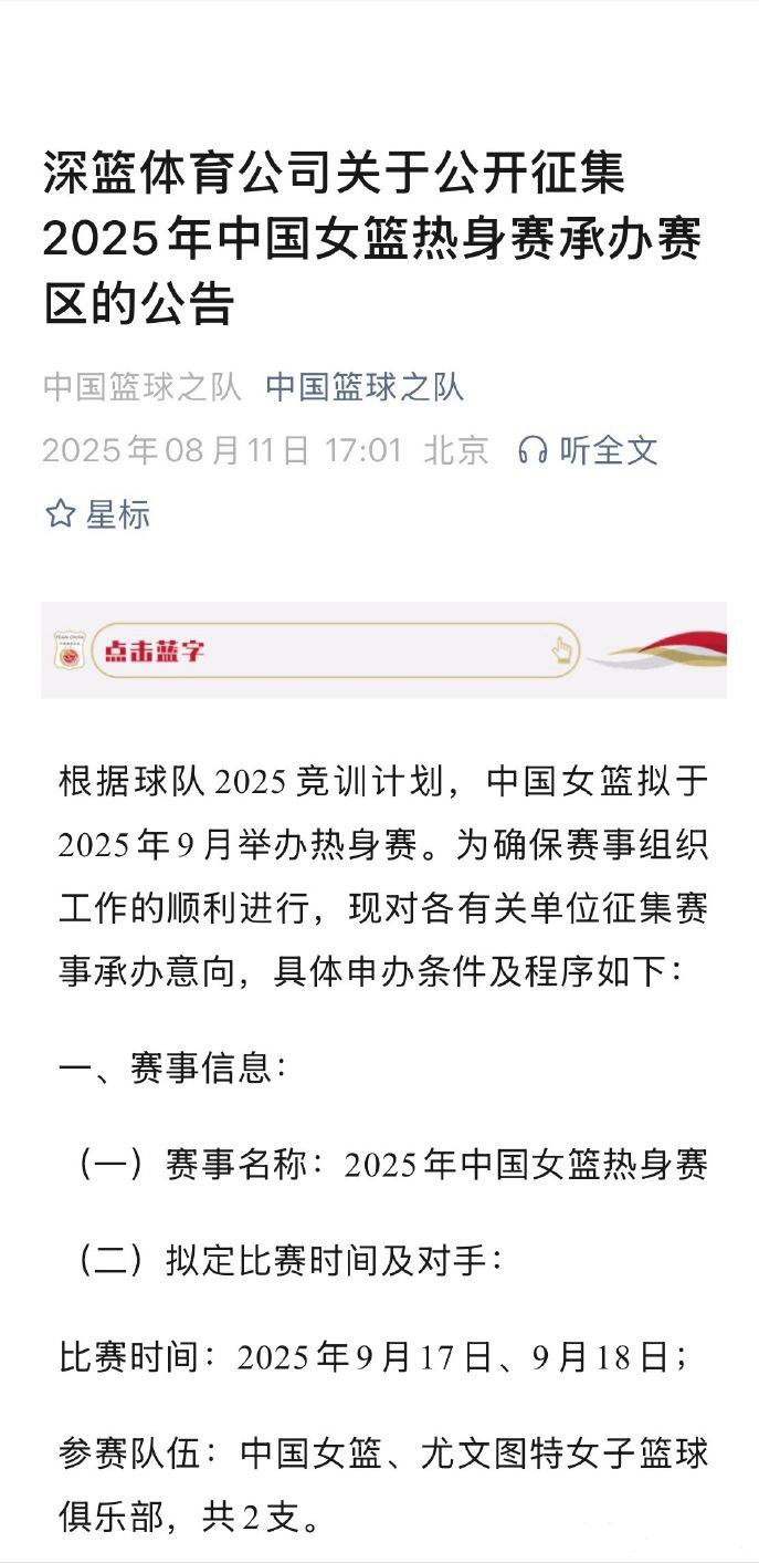 根据中国篮球协会官方公告,球队已确定与西班牙甲级联赛劲旅尤文图特女篮进行两场封闭教学赛,比赛日期定为9月17日至18日,采用背靠背赛制。值得注意的是,中国男篮曾于2024年与该俱乐部男篮队伍有过交锋记录,双方各胜一场(65-70负,65-62胜)。目前赛事承办城市仍在公开征集中,具体举办地将根据场地条件及后勤保障能力最终确定。